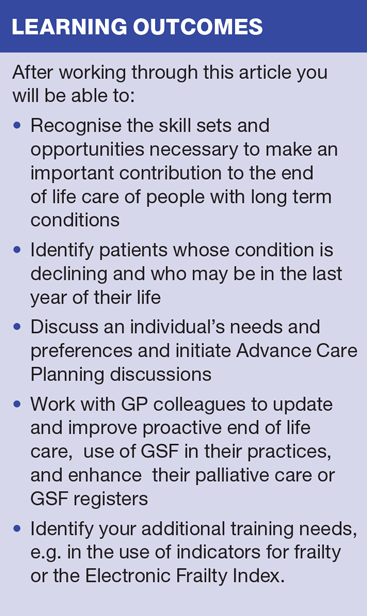 As an ageing population places ever-greater demands on practices, with many more people living longer with long term conditions (LTC), multi-morbidity, frailty and dementia, end of life care (EOLC) is widely recognised as a challenging area for primary care teams. A range of reports and studies have highlighted continuing challenges in health and care services, and expected standards of personalised, high quality, joined-up care for people nearing the end of their lives are not always being delivered.1,2 However, more can be done proactively to ensure patients are recognised earlier, leading to more planned care, centred on the needs, wishes and preferences of patients.