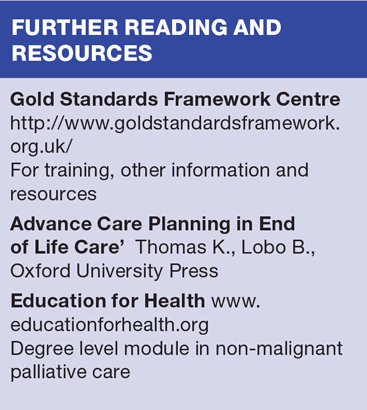 Earlier planning can ensure earlier discussions, or ACP, about what is important to the patient: what they do and don’t wish to happen, as well as who will speak for them and Lasting Power of Attorney. These discussions help clarify their thoughts and preferences on issues such as repeated hospital admissions, and can lead to better preparation for later decline as well as more practical help. It can also assist discussions with family and carers. ACP is a key part of good end of life care and is included as one of the important steps of GSF.9 These discussions form the basis of an agreed plan which should shape ongoing care for these patients in their final months. This should then be shared with other health and social care providers and, with regular reviews, significantly increases the likelihood of good care and reduced hospitalisation, right up until the end of life.