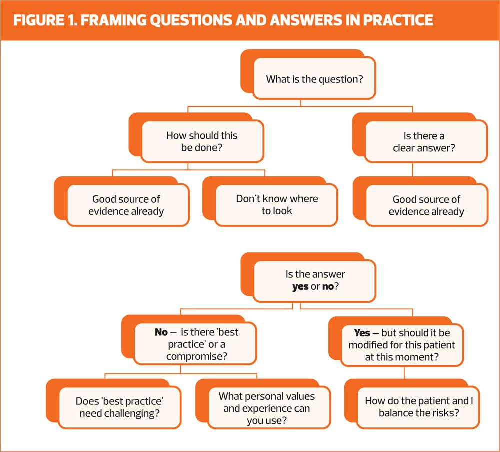 In clinical practice you will (or should) always have questions, and these will tend to generate further questions. This article considers how to manage daily queries about nursing practice in the complex interplay between evidence, resources, uncertainty and regulation. This is not an article with answers. Rather, it is intended to be a basis for reflection, for when you have questions in clinical situations but don’t have time to answer them, or don’t know where to look for those answers.