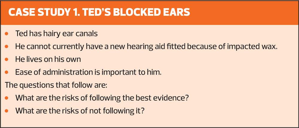 The questions you ask should be simple so that you can search for them, and then introduce modifications when you apply the answer to a particular patient. In Case study 1, Ted’s situation might suggest a prescription for sodium bicarbonate drops because he can put them in himself with ease. The evidence suggests that they will be as effective as olive oil.