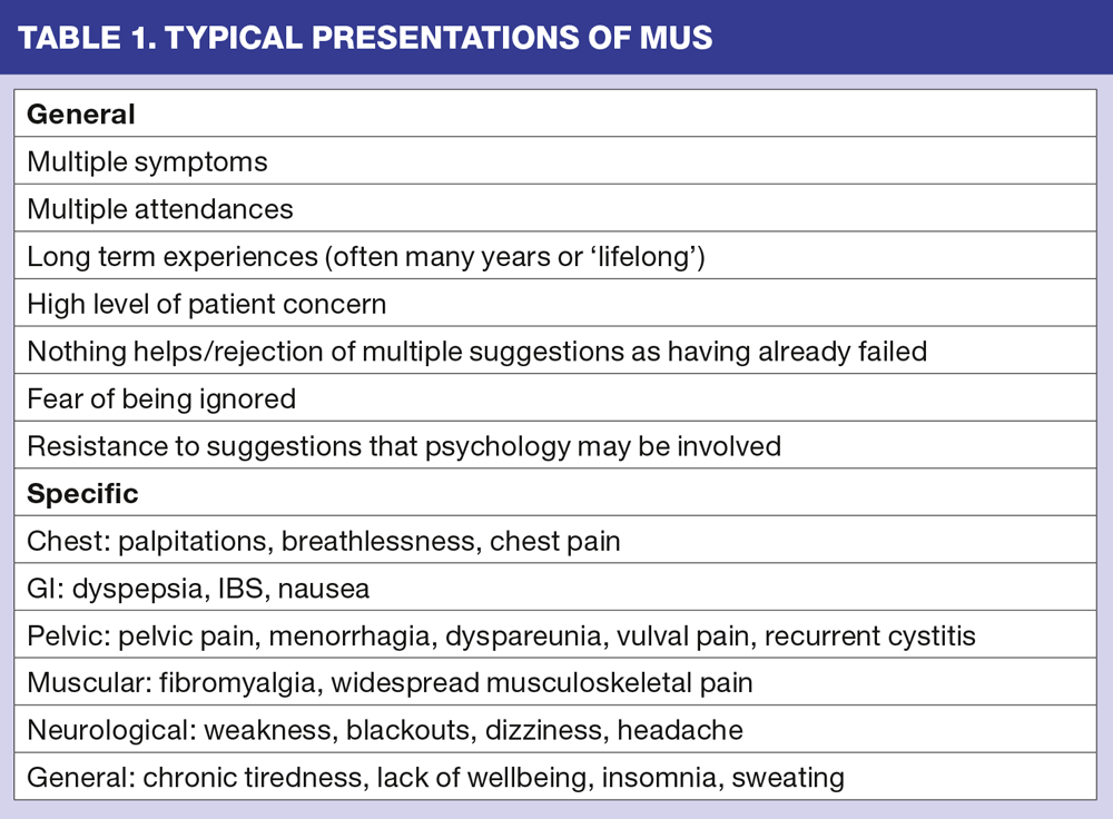 Up to a fifth of primary care consultations fit the category of MUS.1,2 They can relate to any or all systems of the body and often coexist in groups. Anxiety and depression are commonly present, and many MUS can be exacerbated by anxiety and stress. We must be careful, however, not to infer that, because stress is present and makes symptoms worse, it is the only cause.