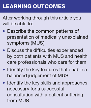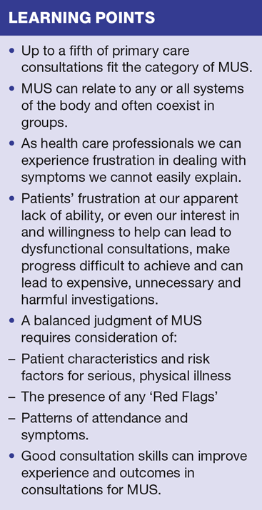 Most of you will have seen patients with MUS and will be familiar with the sense of frustration at not being able to offer straightforward physical solutions. The frustrations we feel in dealing with symptoms we cannot easily explain is nothing compared to patients’ frustration at our apparent lack of ability, or even our lack of interest or unwillingness to help. This easily leads to dysfunctional and unhappy consultations, and can make progress difficult to achieve. It can also lead to expensive, unnecessary and harmful investigations.