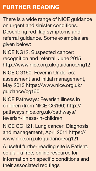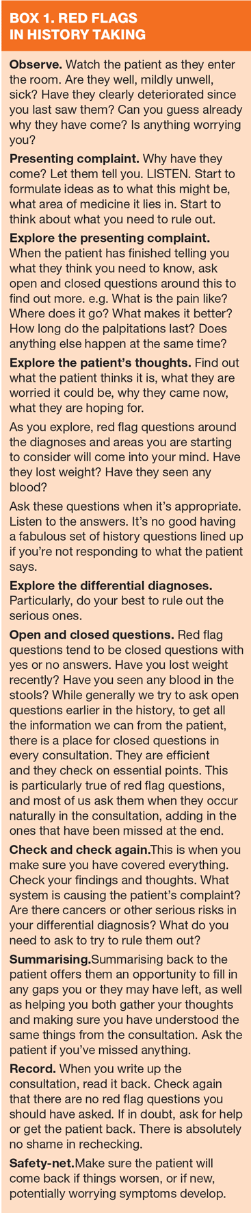 Knowledge and understanding of red flag symptoms is an important part of history taking, and it is important to record negative as well as positive findings, but it is only useful when combined with thorough history and examination, listening to the patient and adopting a systematic and thoughtful approach.