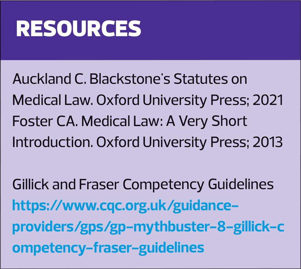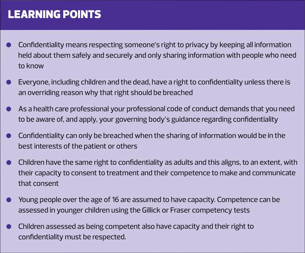 Children have the same right to confidentiality as adults and this aligns, to an extent, with their capacity to consent to treatment. Capacity means that they have the ability to comprehend the information needed in order for them to make a decision to consent to medical treatment, and they can use and weigh up that information when deciding. Competence is a person’s ability to make and communicate their decision to consent to medical treatment. Capacity is.automatically assumed from the age of 16, but competence can also be assessed via the Gillick or Fraser competency test in younger children.6 If a young person is competent then they also have capacity and they should expect to have their confidence respected.