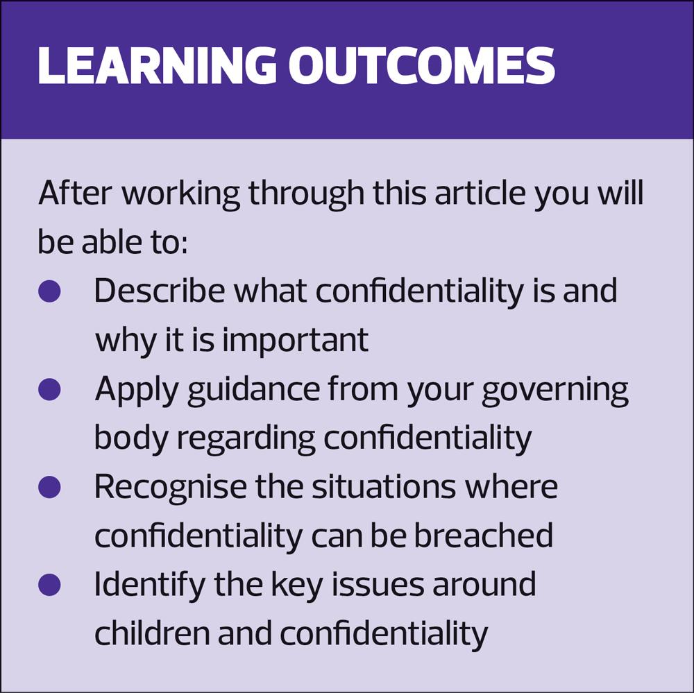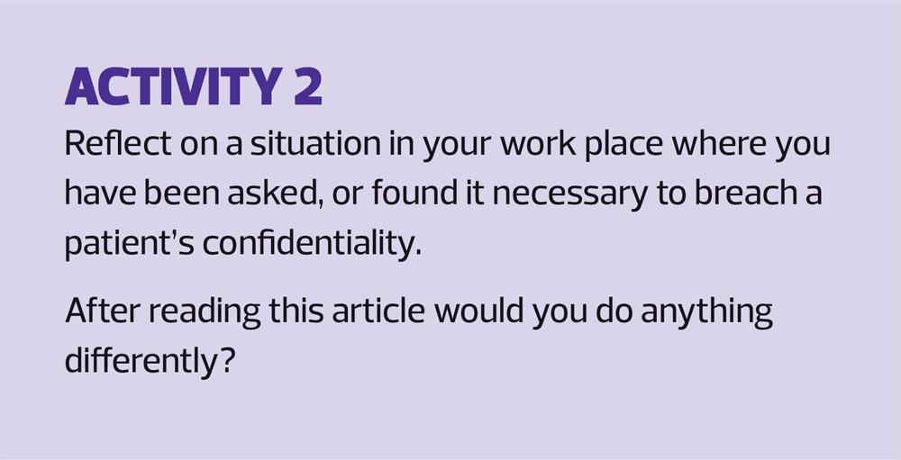 The Nursing and Midwifery Council has produced guidance which echoes that of the Caldicott Principles.4 It has also published a guide to using social media responsibly, which includes reference to confidentiality.5 Nurses should also be aware of the requirements of the code of conduct with respect to observing confidentiality in all situations.