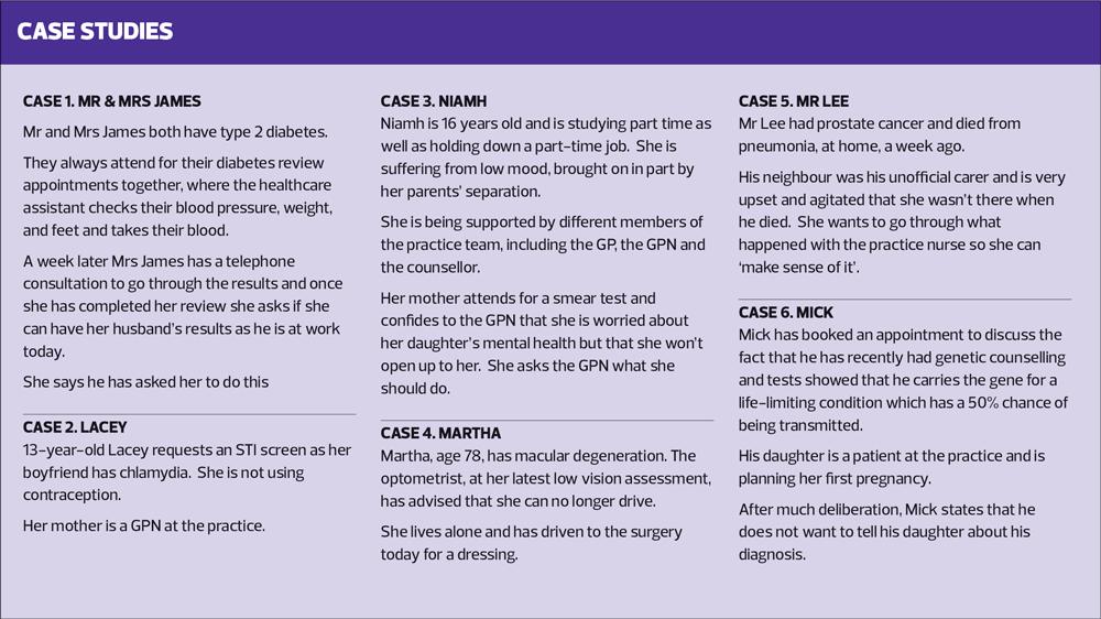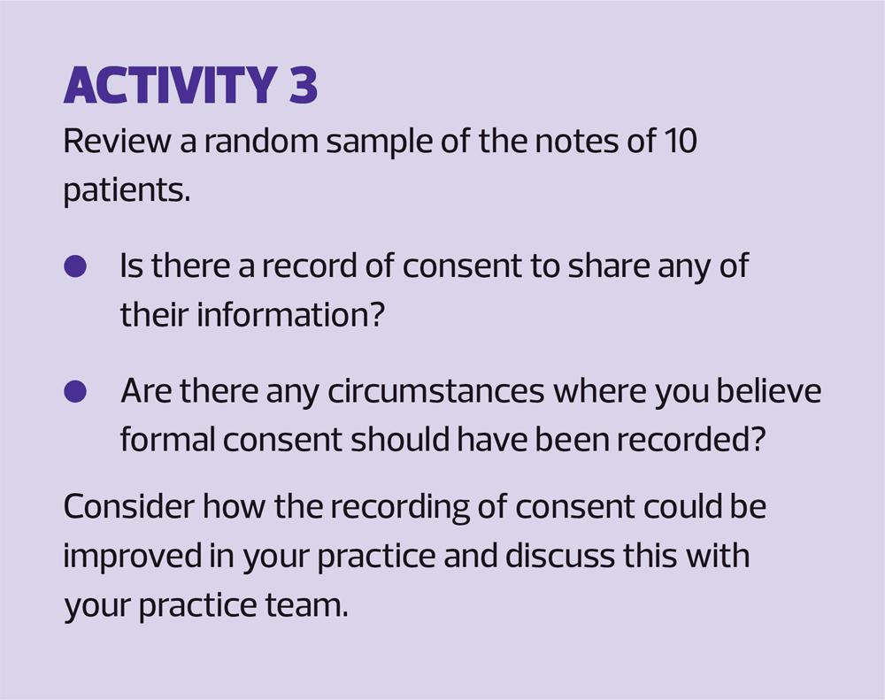 Most patients understand that confidential information will be shared with other healthcare professionals, for example when they are referred to see a specialist or another member of the multidisciplinary team. However, practices are now advised to ask for and document consent in the records. In the case of Mr and Mrs James (Case 1), it may well be that they have a documented agreement on the practice computer stating that they can: