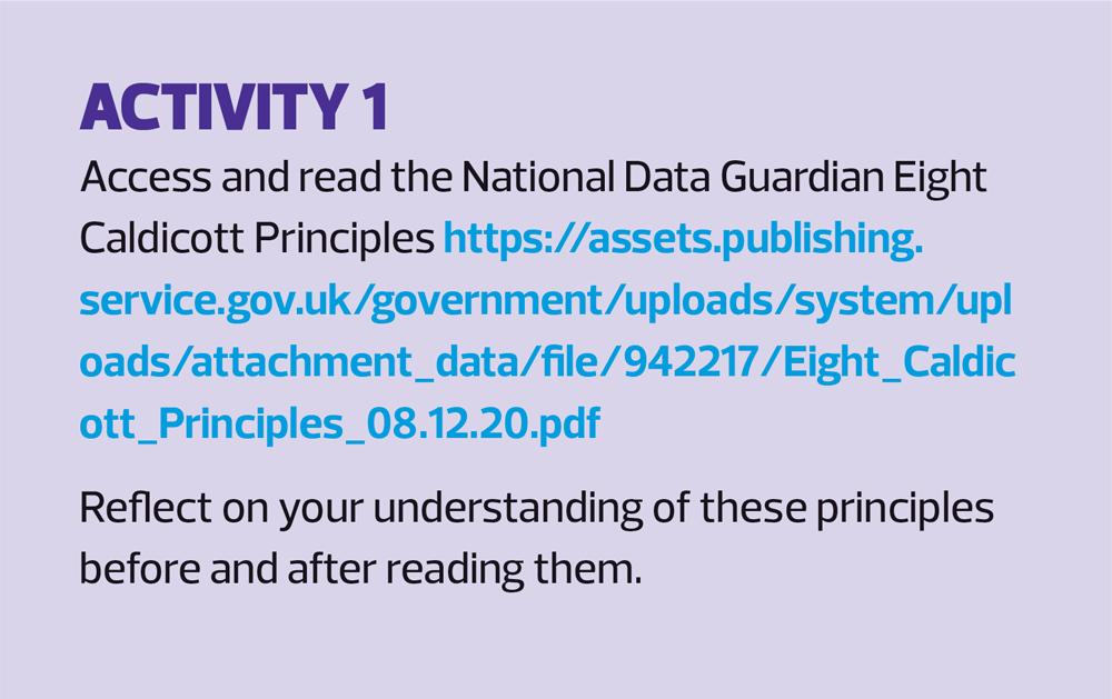 In 1997 a review, chaired by Dame Fiona Caldicott, was commissioned to look into the use of patient information, and the ability of the increasing use of information technology in the NHS to disseminate patient information rapidly and extensively. This committee published its report, ‘Report on the Review of Patient-Identifiable Information’, usually referred to as the ‘Caldicott Report’, in December 1997 and came up with eight ‘principles’. (Box 1) These ‘Caldicott Principles’ were developed to explain how, when and why confidential information should be handled correctly in a healthcare setting.3 (See Activity 1)