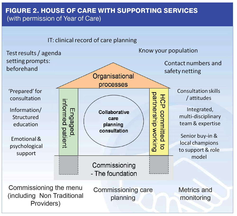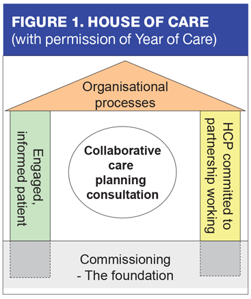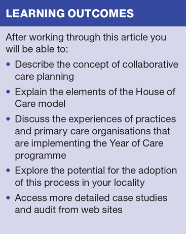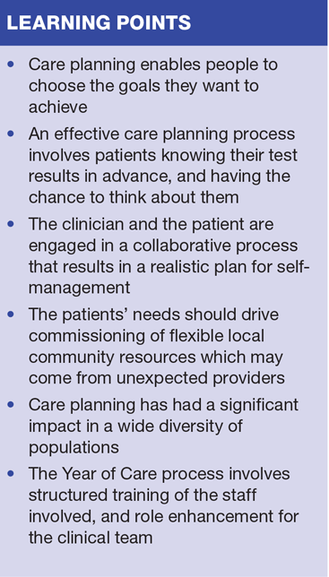 The Year of Care programme has the collaborative planning consultation at its centre – look again at the House of Care – which then generates a new cluster of local initiatives to help people achieve the goals they have set. Secondary care has bought into the programme in many areas, such as North Tyneside Diabetes Services,6 with the same planning process nurturing patients’ expectations of involvement and shared decision-making. Community nurses and integrated care teams are being trained in other areas of the country.
