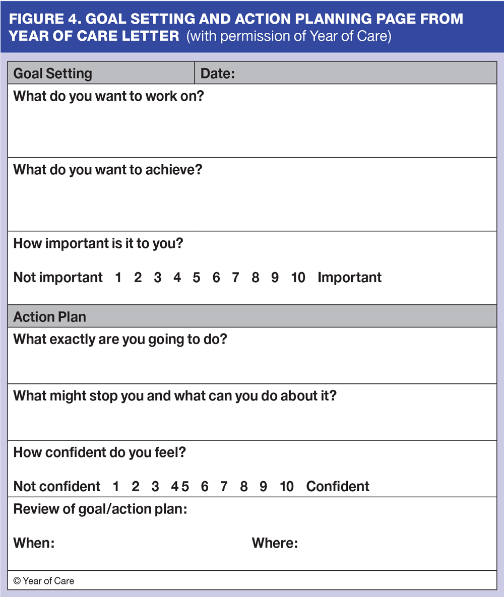 At the second Care Planning appointment, therefore, both nurse and patient will have seen the results in advance. This saves time in this appointment and allows the patient to lead the review. Time in this appointment can then be spent planning care together, based on the Goal Setting and Action Plans the patient has already been sent, [Figure 4] rather than focusing on new data. This can have very positive effects on the patient/health professional relationship and patient satisfaction.4