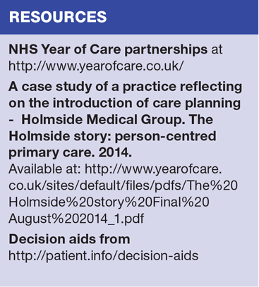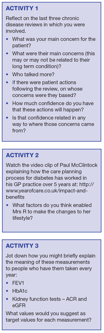 The international evidence base for improving care in LTC is exemplified in the Chronic Care Model,2 where a partnership between an engaged empowered patient and an organised proactive system produces better outcomes. Patient-focussed care and care planning is a central theme of government policy,1 but effective delivery of sustainable change has proved elusive.3 Practice nurses, who have been at the forefront of chronic disease management in primary care for the last 25 years, will recognise this and will have witnessed the difficulties at first hand.