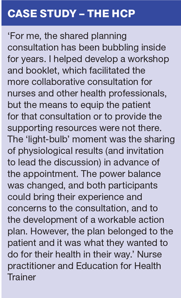 The nurse (or doctor, or dietician) does not focus the whole consultation on giving advice. The consultation, instead, revolves around the health professional giving relevant information, highlighting any key implications of the current results, and helping patients to build a self-management plan that has achievable goals. A date is also set for review. This style of consultation may mean that we, as nurses, have to do things differently. We will have a road map but we will be in the passenger, rather than the driving seat, learning to listen attentively and discern the patient’s priorities which then set the agenda for the consultation.