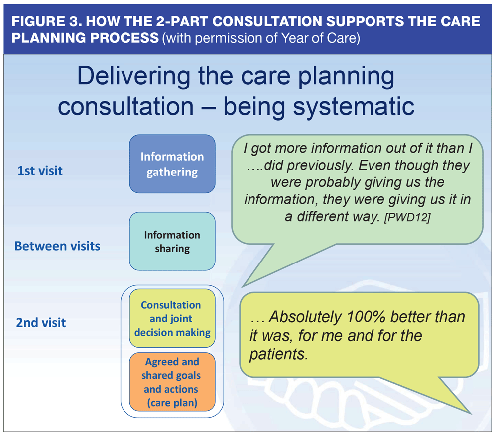 Changes do not happen overnight. Practices that have employed the Year of Care process for several years suggest that it takes at least two annual cycles before measurable changes can be documented. And for some individuals it may be more.6,8 However, a rapid ‘win’ is the increased satisfaction from the consultation, as noted by the Year of Care report:4