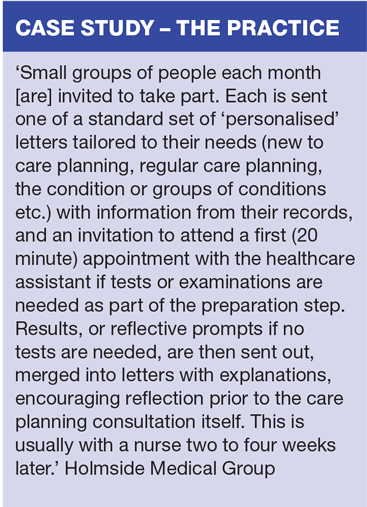 Care-planning requires at least 20 minutes, and a health care professional with listening and collaborative skills. There have been concerns that this process is too expensive in time and postage, and again this has not been born out in practice.6 Financially it appears to be cost neutral, with fewer extra reviews, and the extra work involved in implementing the changes has been balanced by closer team working and more rewarding consultations for HCAs, nurses and GPs:4