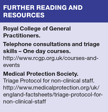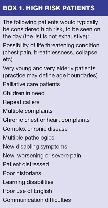 The practice should have provided and agreed protocols to support your decision-making and ensure consistency and good practice. These should include lists of high-risk patients and high risk conditions that always justify ‘on-the-day’ appointments. (Box 1)