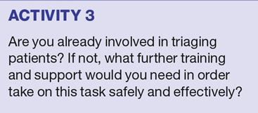 As general practice struggles to meet unprecedented levels of demand, practice nurses are increasingly involved in triage. For nurses to become competent and confident, and patients triaged safely and effectively, specific training and the support of the practice team is essential