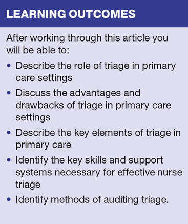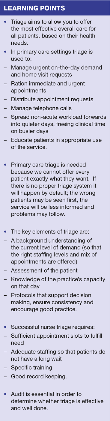 Practice nurses are increasingly asked to take part in the triage of patients, in order both to manage demand and to make sure patients are seen with appropriate urgency. Good triage can educate patients, improve efficiency and improve the quality of care the practice offers. However good triage needs skilled assessment, communication, risk management and good clinical skills. In this article we discuss triage, the ways in which it is offered in primary care and what you need to be a more competent and confident triage nurse.