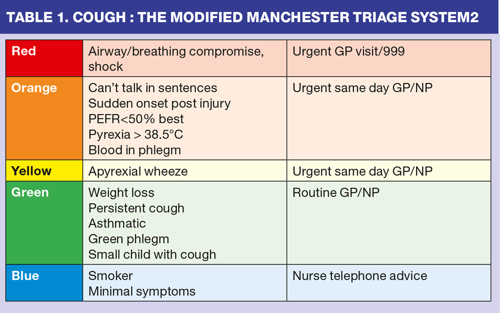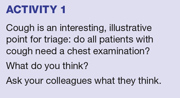 Cough is an interesting illustrative point for triage: do all patients with cough need a chest examination? A paper published in 2002 offered a possible triage system for cough in a primary care setting.2 Crucially this guidance was developed by a team (yours might be different) and, while not exhaustive, was felt to cover most common presentations. (Table 1)