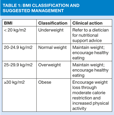 One such tool is 'Malnutrition Universal Screening Tool' or 'MUST' (www.bapen.org.uk), which is recommended by NICE. The 'MUST' is a quick and simple tool which has been validated for use in primary care and involves 3 steps: assessment of body mass index (BMI), recent changes in weight and likely nutritional intake over the coming 5 days. Although 'MUST' primarily screens for malnutrition it also highlights those patients with an excessive BMI. However, BMI alone is not an indicator of good nutritional status. Table 1 shows BMI classifications and actions.