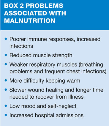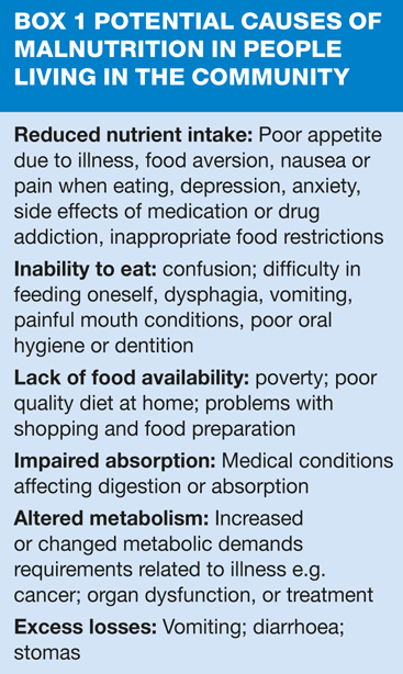 Causes of malnutrition are very varied and may result from social, psychological or medical causes. Some examples that are likely to occur in the community setting, as opposed to hospitalised patients, are shown in Box 1.