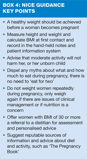 NICE guidance recommends that healthcare professionals should make it clear to women with BMI over 30 the risks they face.11 A first step is identifying whether a women is actually obese, and so measuring weight and height at the first contact, being sensitive to any concerns she may have regarding her weight, is crucial. From this, the BMI can easily be calculated. The BMI should be discussed with the patient and any risks explained, and a diet and physical activity plan agreed. Simple dietary goals might include eating breakfast, carrying healthy snacks and eating at least 5 portions of a variety of fruit and vegetables. The key points from the NICE guidance on weight management in pregnancy are shown in Box 4.