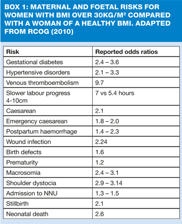 In recognition of the substantial risk of obesity in pregnancy, NICE guidelines11 have been produced which indicate that health professionals should encourage obese women to reduce weight before becoming pregnant.