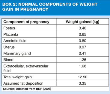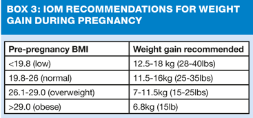 In the absence of UK guidelines on optimal weight gain during pregnancy, the American Institute of Medicine17 guidelines are often used. (Box 3) The IOM defined suitable weight gain for women of varying BMI to reduce risk of perinatal mortality, premature birth and foetal growth retardation, to prevent foetal undernourishment and achieve optimal neonatal birth weight. The recommended weight gain is inversely related to pre-pregnancy BMI, but zero weight gain is not recommended.