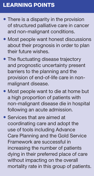 People dying from non-malignant disease in the UK have poorer care provision than those dying from cancer. The key challenges to addressing this inequity are the difficulty in identifying the end-of-life phase, reluctance of HCPs to discuss issues around prognosis or refer to specialist palliative care services, and the lack of identification of and planning for the patient's end-of-life wishes early on in the course of their disease.
