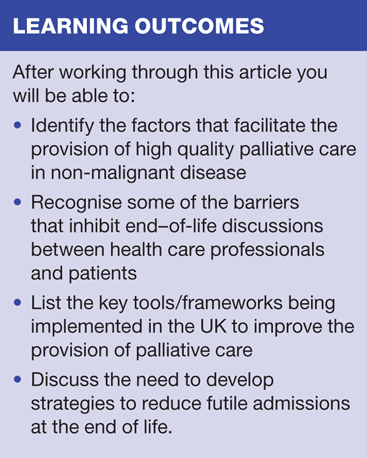 In 2008, the Department of Health (DH) published a strategy document aimed at improving the quality of care provided for people at the end of their lives. It focused on an 'End of Life Care Pathway' (Box 2) and specified that it applied equally to people with either malignant or non-malignant life-limiting disease.4 This article will explore the problems around the provision of palliative care to people with non-malignant disease and will discuss some of the keys issues that can be addressed to help improve the quality of care.