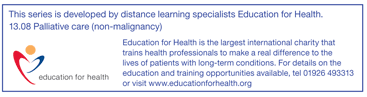Currently only 12 to 15% of referrals to specialist, palliative care services are for non-malignant conditions.20 (Table 1) The majority of palliative care for these individuals is provided by the generalist care team. It is therefore important that these HCPs have the knowledge and skills to deal with the challenge of managing these patients and are able to recognise when they need to be referred to specialist, disease specific or palliative care services.21