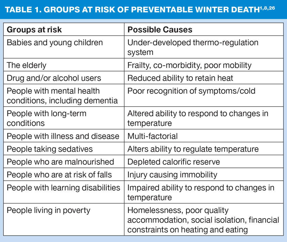 Practice nurses are in an excellent position to be a part of the implementation of aspects of the Cold Weather Plan, and it is hoped that by sharing what is currently known about contributory factors to preventable winter deaths, they may feel better placed to do so.