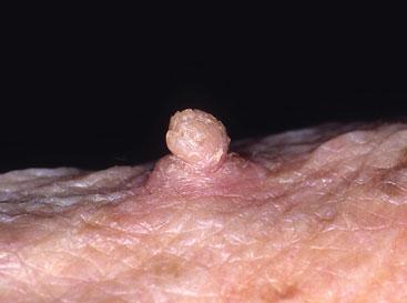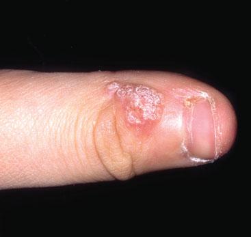 Viral warts are caused by the human papilloma virus (usually type 2 on the hand) and may be contracted by direct contact, or by sexual contact. Swimming pools are also a common source of contagion for viral warts, which grow with a hard, raised surface with black dots visible. They may occur as a result of the Koebner phenomenon where an area of trauma may be replaced by warts. Warts may disappear spontaneously, usually after a wait of at least 6 months. On the hands especially, their unsightly appearance is a reason for treatment. Standard treatment is the careful application of a paint such as those containing salicylic and lactic acids — wipe it off if any product gets onto normal skin — or cryotherapy. However, in my experience, the majority of children under 10 years do not like cryotherapy. I'm unclear if this is because of the appearance of a stream of liquid nitrogen or the pain that it may induce.