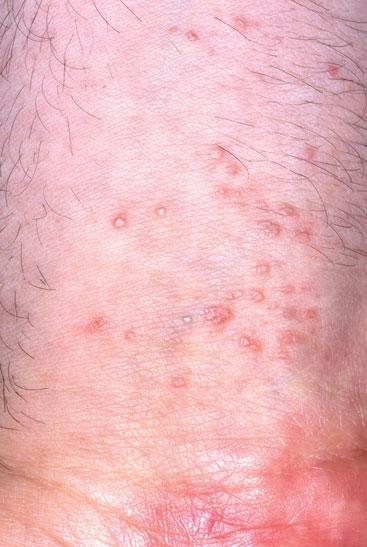 Lichen planus is a symmetrical eruption that affects the legs, wrists, forearms, genitalia and buccal mucosa. The commonest place for it to commence is on the limbs and it may spread quickly. It is itchy, and manifests as small flat lesions a few millimetres in size that develop a purplish colour. As with viral warts, it may show the Koebner phenomenon. The rash may take several months to clear, with some people still suffering at 18 months. If the skin is itchy then application of a moderately potent steroid is recommended. Complications include a scarring alopecia, and nail changes — pitting and longitudinal ridging.