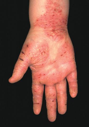 The involvement of the hand in this child was part of an extensive acute eczema. The bright red area visible on the wrist is typical of acute eczema. On the palm is an area of creased skin which looks more like acute on chronic eczema. There is widespread cracking of the skin, probably as a result of dryness along with scratching. On the tip of the little finger is what appears to be a golden crusted area. This is highly suggestive of Staphylococcus aureus, and a combination ointment containing steroid/antibacterial such as Fucidic acid/betamethasone is required. Application of an emollient is essential to improve the dryness of the skin.
