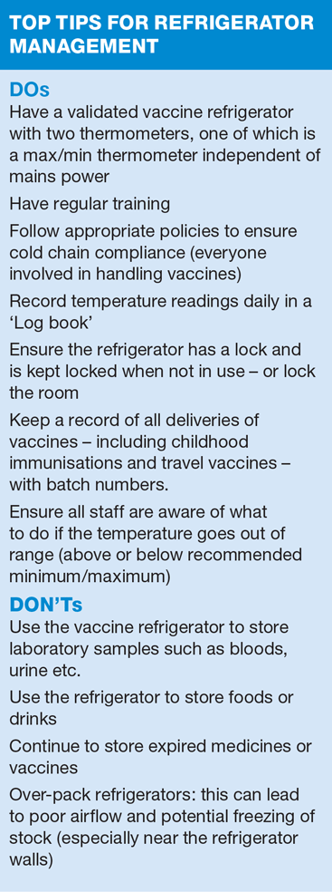It is the GP’s responsibility to have a robust medicines management policy in place, which clearly defines the way in which medicines are stored, handled, transported, and administered and practice nurses are often involved – particularly with their role in administering vaccines. Much of the identified non-compliance has been around refrigerator management and maintenance of the cold chain.