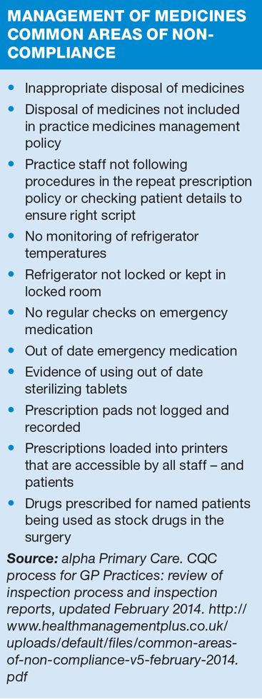 The Care Quality Commission (CQC) is in the process of revising its inspection processes but in the meantime, inspections in general practice continue and one of the areas of scrutiny is the management of medicines (Outcome 9, Regulation 13).