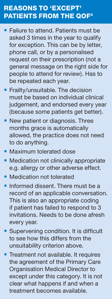 Practices with any sense will be actively seeking out patients who can be excluded — excepted — from the targets so that the base number for target assessment is minimised. The box shows reasons why patients can be excepted from clinical indicators.