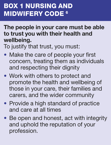 6. Nursing and Midwifery Council. The code: Standards of conduct, performance and ethics for nurses and midwives. UK: NMC; April 2008