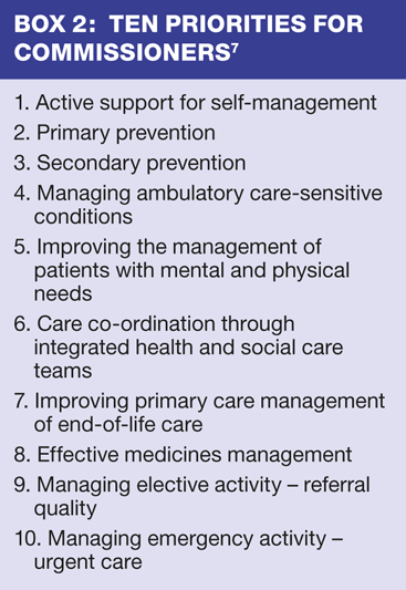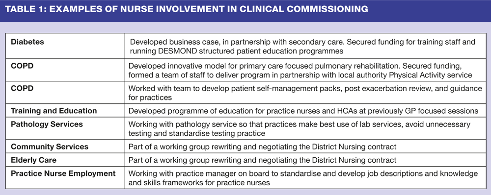 The King's Fund7 has identified ten priorities for commissioners, (Box 2) which provide focus for their activities and guide commissioning intentions. Several aspects of a practice nurse's daily workload will spring to mind after a quick perusal of this list. Practice nurses have a wealth of experience in many of these areas, particularly points 1-6 and 8. We should be mindful that it is nurses - practice nurses, health visitors, district nurses, community matrons and community psychiatric nurses - who deliver the majority of primary and secondary prevention, and management of long term conditions. Table 1 gives some examples of how nurses have been involved in clinical commissioning within Gateshead CCG.