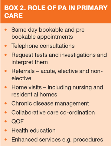 There are a range of potential benefits that the PA role can bring to enhance the service already delivered in primary care. The PA role provides an opportunity to improve and develop the skill mix, further increasing patient access and decreasing the medical workload. In several studies PAs were found to be acceptable, effective and efficient in complementing the work of GPs, and that PAs (due to their broad medical knowledge base and skills) can provide a flexible addition to the primary care team.10 Studies also reported high levels of patient and doctor satisfaction, concluding that PAs are competent and safe, as well as being productive in terms of handling appointments and cost.11,12 Therefore employing PAs may help to reduce GP locum budgets, and provide consistency and continuity for patients.