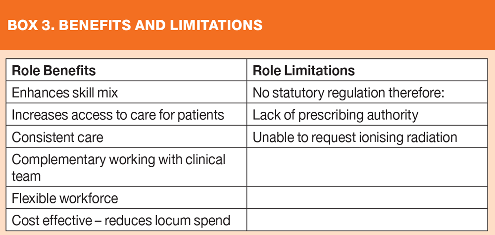 Currently there are limitations to the role. PAs are not yet a regulated healthcare professional group and as such they are unable to prescribe or request ionising radiation. Both of these limitations could be conquered with the advent of statutory regulation. These issues are being actively addressed by the FPA at a national level.