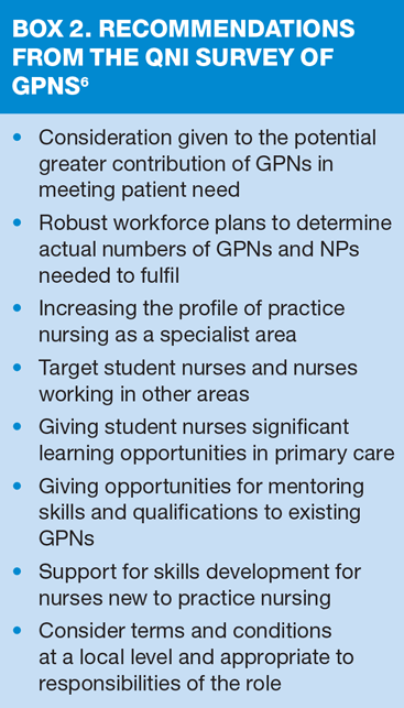 Another finding from the QNI survey was that nurses currently working in primary care need to have adequate support to do the job, opportunities for professional development, a recognised career structure, strong leadership, equality in the workplace and to be listened to. Consultation with and investment into the current workforce are vital if the plans to take general practice forward are to be realised (Box 2).