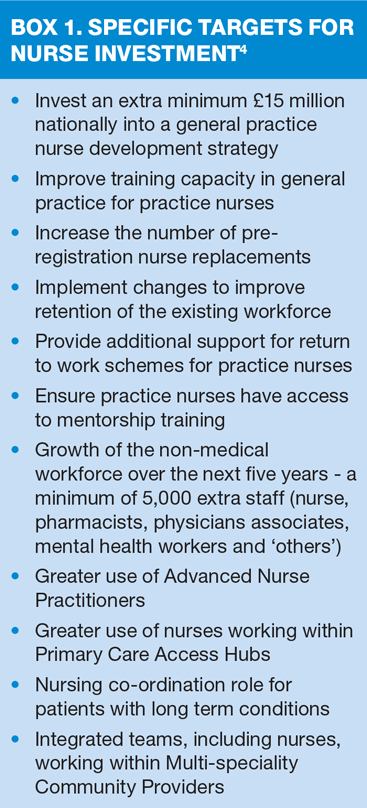 So, what is to be done? Also published in April was NHS England’s General Practice Forward View, which set out the investment and workforce plans needed to improve and sustain the future of general practice.4 It acknowledged that its ‘transformation plan’ could not be delivered without significant recruitment and expansion of the workforce and set out a multi-billion pound strategy to ‘get general practice back on it’s feet’.5 One of the aims of is to double the rate of growth in the primary care workforce over the next five years, by appointing an extra 5,000 doctors supported by a minimum of 5,000 extra non-medical staff, including nurses, pharmacists, physician associates and mental health workers. It accepted that its targets were ambitious in terms of recruitment but explained: ‘We must use every effort to try.’4 Expansion of the GPN role is clearly seen as an integral part of the success of the future of general practice with investment concentrating on attracting more nurses into primary care, developing more advanced nurse practitioner posts, employing practice nurses in Primary Care Access Hubs and promoting greater involvement of practice nurses in co-ordinating care for patients with long term conditions. Box 1 outlines NHS England and Health Education England (HEE) plans of practice nurse investment for the future.
