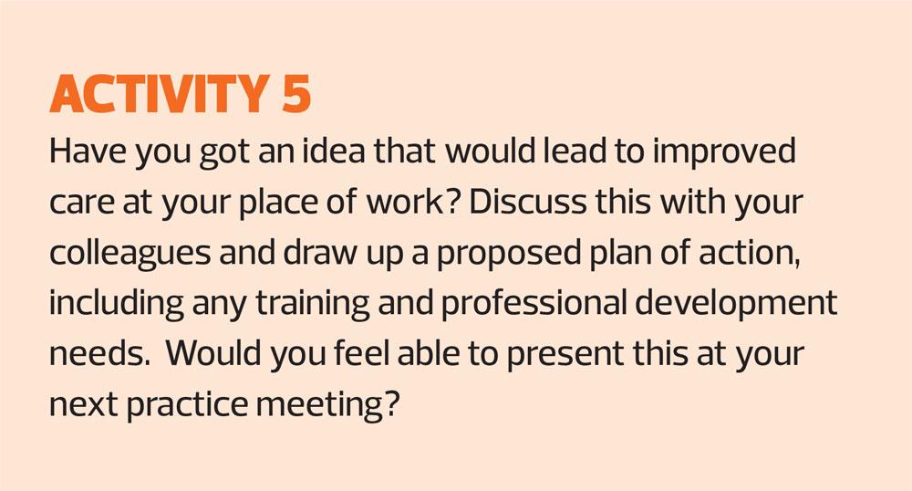All of these areas will resonate with GPNs as relevant to their role. As front-line workers GPNs are best placed to understand the issues and identify solutions that will lead to the improvements envisioned in the GP contract. They will need to appreciate their own skills and competencies and those of their professional colleagues and be able to identify training needs that may arise as a result of proposed service developments. (Activity 5).