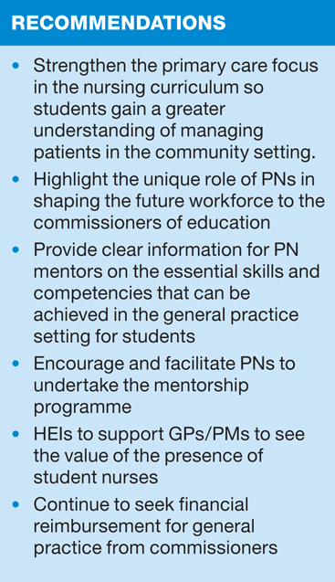 This study only explored the situation in one locality, and it would be interesting to investigate whether PNs are providing the same level of informal student support nationally. If it transpires that this model is duplicated throughout the country then PNs would be making a significant but unrecognised, and currently unsupported, contribution to nursing education. There is huge pressure on the HEIs to provide placements where the students learn to care in real-life settings in order to enhance employability and promote non-traditional environments as post qualification career alternatives.4,5 Across the UK nurses aged 50 plus are concentrated in key and growing sectors of the health workforce such as primary and community care,6 and an RCN survey of practice nurses across eastern England revealed 98% of all nurses working in GP surgeries are over the age of 40.7 While there is no immediate cause for alarm, GPs and Clinical Commissioning Groups need to prioritise planning for a future nursing workforce. One of the obvious solutions would be to collaborate with placement providers in order to nurture general practice nursing as a viable career pathway for new registrants. However, the need to increase general practice placements must be accompanied by close communication between the placement practice and the HEI, and there is a considerable amount of work to be undertaken if both PN and student are to benefit from the experience.