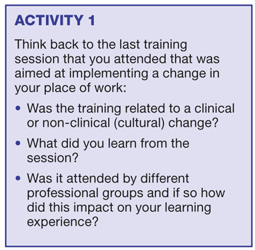 It is important to be realistic in your expectations of what can be achieved in a single teaching session. Changing practice may not be possible following short interventions as these may not give sufficient support to enable change in the workplace to be effected. Sustained change requires on-going follow up and management.