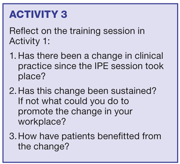 Sustainability of change is variable; in studies this ranged from 8 to 21 months.6,7 The changes to individual participants and the wider organisation are often immediate and relate to specific areas of practice. IPE builds on the confidence and self-belief of the participants, leading to short-term change. Changes to practice are more easily sustained while feedback is continued, but without on-going reinforcement a sustained change is less likely.