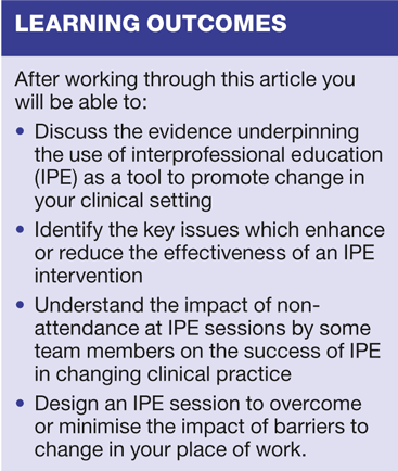 The process of changing clinical practice is well recognised to be complex. The most common barriers to implementing change are time, workload and resistance from colleagues.5 Implementation of change can be undermined by a lack of understanding of others' roles, poorly co-ordinated teamwork and poor communication.6 Strategies to overcome any or all of these barriers are valuable and IPE has been shown to be a useful intervention in this regard. It can promote and develop communication between colleagues,5 encourage sharing of resources,5,7 and increases the ability of participants to influence change in their area of work.6 This ability to influence change stems from a feeling of being more valued and supported by colleagues, which in turn promotes confidence and self-belief.