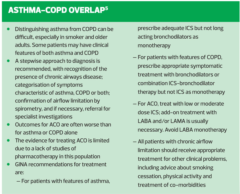 Although asthma and COPD are different conditions with different pathological processes, studies suggest that there is some overlap between the conditions and so some people will have elements of both. Careful history taking, assessment and management should ensure that each individual is treated appropriately. There are no guidelines specifically written for ACO and clinicians will therefore need to use their clinical judgement, knowledge and experience to identify the most appropriate interventions for each individual and to support patients with shared decision making. Off licence prescribing is permissible but should only be implemented when there are no licensed options available and with the patient’s full understanding and agreement. Referral to members of the multi-disciplinary team – e.g. smoking cessation and pulmonary rehabilitation – should be used to ensure the individual gets the best quality of care aimed at improving their health now and in the long term.