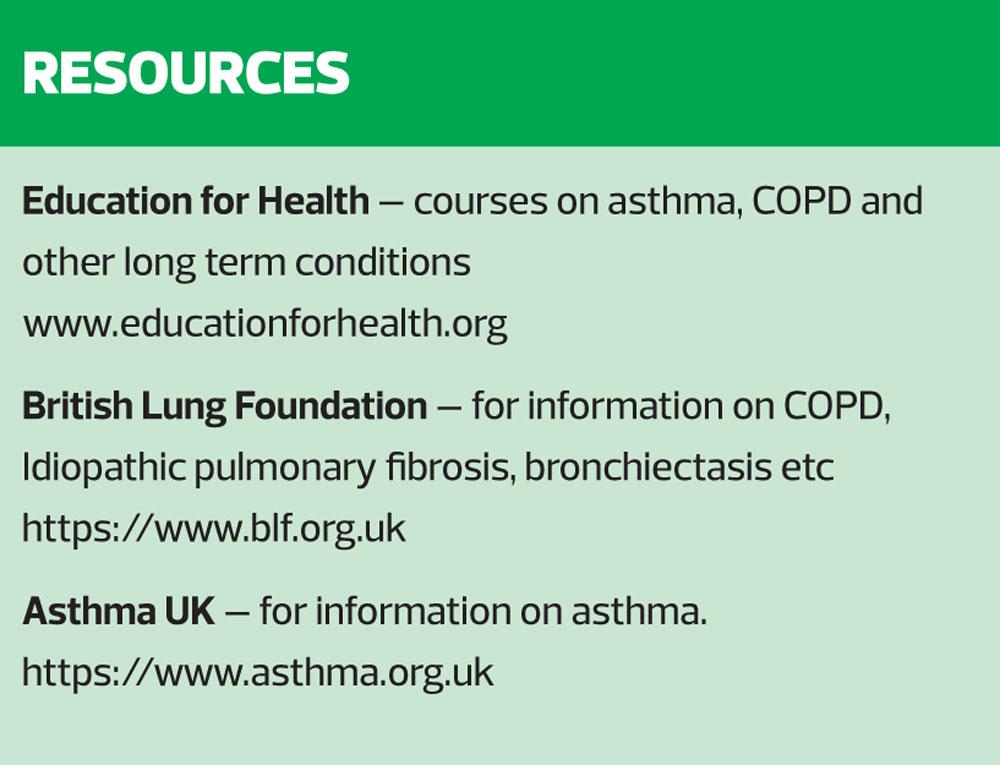 People with asthma should have written personalised asthma action plans (PAAPs) as should those with COPD. There is a range of opinion as to what should be included in these plans. BTS/SIGN says it is important that PAAPs are simple and straightforward. Asthma UK has downloadable PAAPs available from https://www.asthma.org.uk/ globalassets/health-advice/resources/ adults/adult-asthma-action-plan.pdf. The British Lung Foundation (BLF) offers free COPD information packs and self-management plans for health care professionals to give to people with COPD and which contain information about the condition itself as well as what to do if symptoms deteriorate. These are available from https://shop.blf.org.uk/collections/hcp.