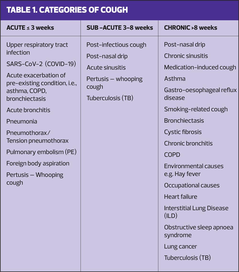Cough is a frequent symptom of many different conditions and is classified into three categories:3